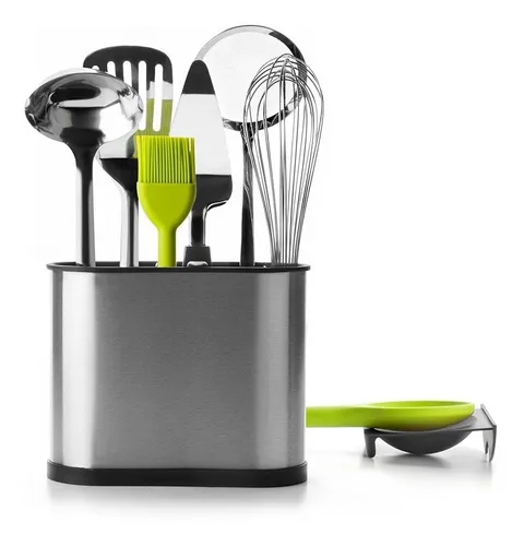 Este contenedor o porta utensilios es de acero inoxidable y plastico.